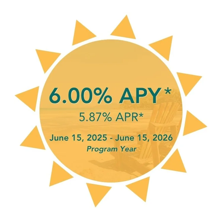 *APY: Annual Percentage Yield, APR: Annual Percentage Rate. Rate advertised is for the 2025-2026 program year. In the event the account is closed or funds are withdrawn before maturity, dividends that have not been credited are forfeited. APY assumes dividends remain in account until maturity; early withdrawals reduce earnings. Dividends begin to accrue once funds are deposited into account. Dividends paid at the end of each calendar quarter and at account maturity on June 15, 2026. Balance computation method is as described in our Truth in Savings Agreement. Monthly direct deposit or payroll deduction of $50 – $2,000 must be set up for account; money transfer apps (i.e.: Zelle, Venmo) do not count as direct deposit. After 60 days of no deposits, Summer Savings Club account will be closed, and funds will be transferred to your regular savings account. Account will not be closed if there are no deposits during the summer months, but will be closed if deposits do not start by October 1, 2025. Earnings transferred to chosen savings account at account maturity. Account automatically renews at maturity with the updated rate for the new program year. Limit 1 Summer Savings Club account per Member. Federally insured by the NCUA.